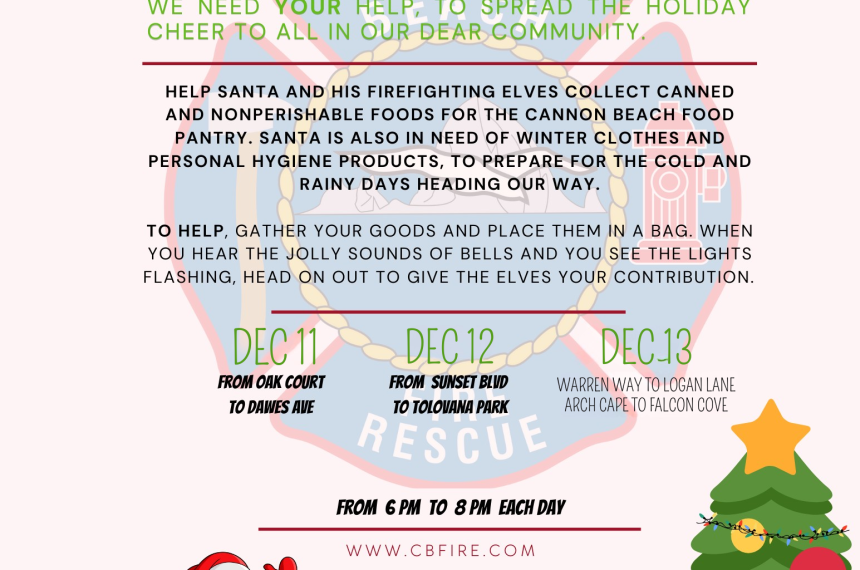 HELP SANTA AND HIS FIREFIGHTING ELVES COLLECT CANNED AND NONPERISHABLE FOODS FOR THE CANNON BEACH FOOD