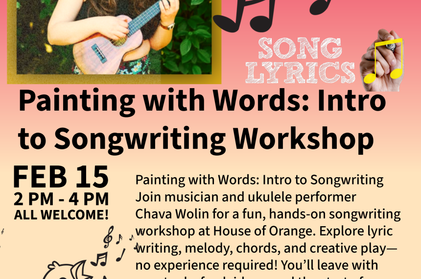 Have a song inside you, but aren’t sure where to start? Ever jot down a lyric or hum a riff only to get stuck? Join us at House of Orange Art Gallery for an energizing, hands-on songwriting workshop led by Cannon Beach’s own performer, ukulele teacher, and festival headliner Chava Wolin.